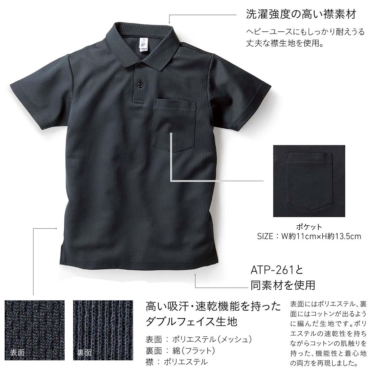 | 大きなポケットが魅力の裏面ドライポロシャツ。 |